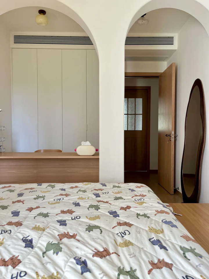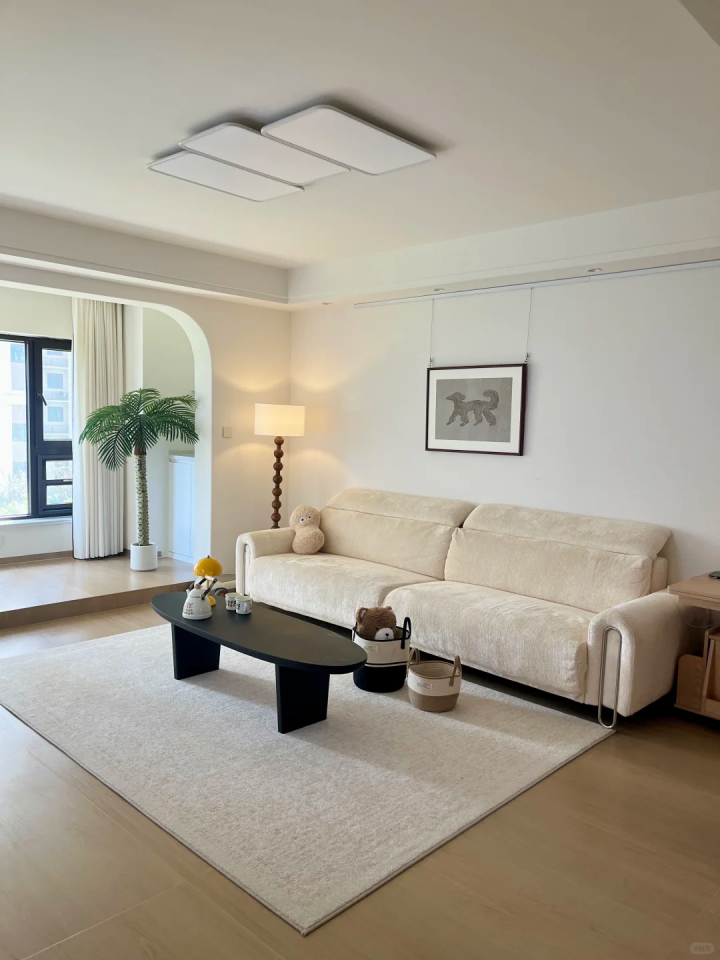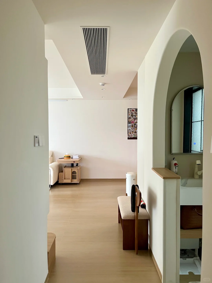 浅色调墙面与地板营造开阔感,拱门设计增添柔和线条。客厅区域家具小巧实用,角落布置充满生活气息,过道衔接自然。