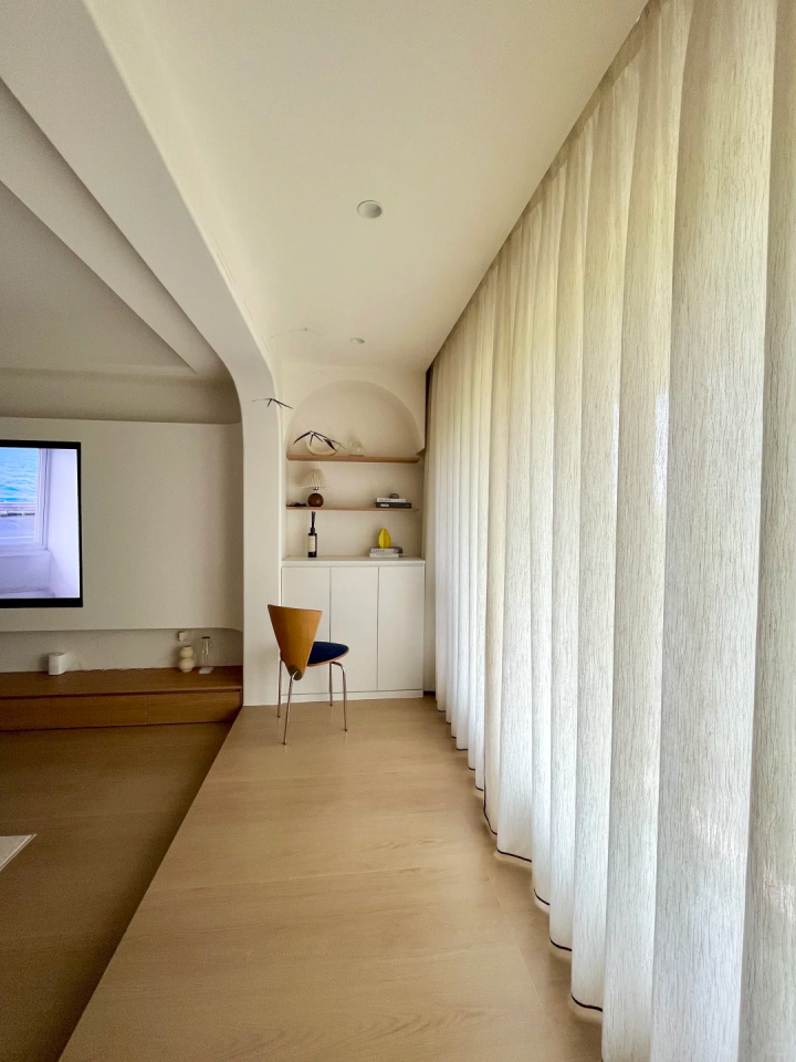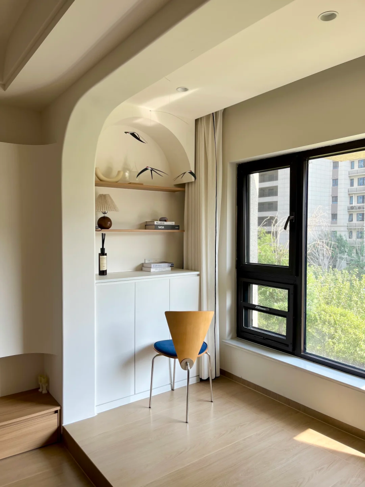 阳台一角,弧形拱门打造出 “洞穴感” 阅读角,原木层板 + 白色柜体收纳有序,搭配造型椅,把窗边空间变成 “治愈小天地”。光线透过大窗洒进来,绿植与建筑远景呼应。