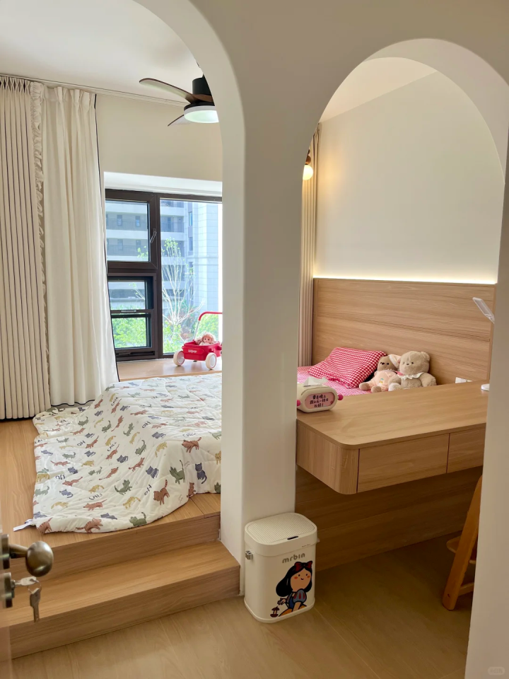 阳台另一端,弧形拱门弱化空间边界,绿植、串珠落地灯营造自然松弛感,可爱抱枕 + 童趣滑滑车,把 “温馨小窝” 氛围拉满。
