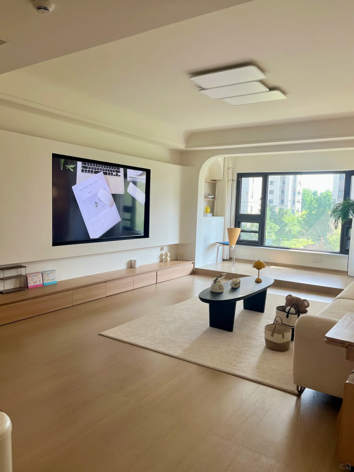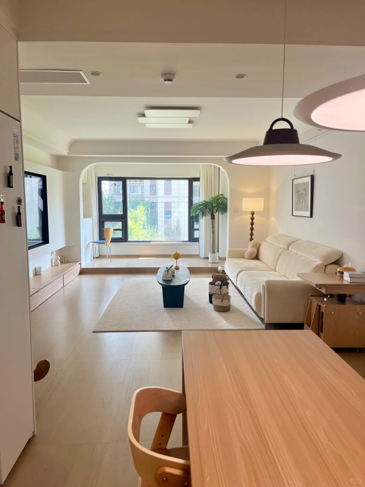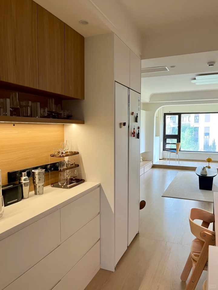 开放式布局串联起餐边区与客厅。浅木色与白色搭配,营造温馨通透感,餐边柜兼具收纳与展示功能,客厅借大窗引入自然光线,装出了 “精致小资 + 开阔松弛” 的平衡感。