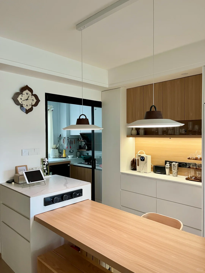 浅木色餐桌搭配同色系收纳区,中和白色柜体的冷感,两盏吊灯对称又有设计感,玻璃移门把烹饪区藏起来,却让空间更通透。墙上花瓣时钟添了点俏皮,把 “实用 + 颜值” 装在小空间里。