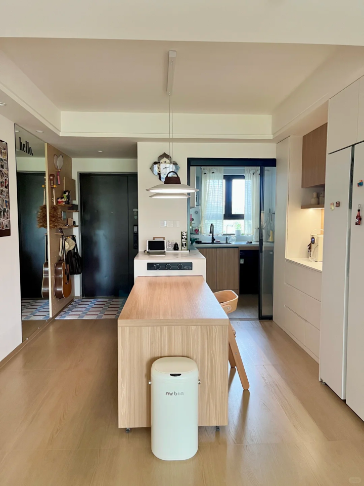 极窄入户➕超小餐厨,真的尽力啦!4㎡的小户型厨房,装修前就做好了布局规划,把冰箱、洗碗机、蒸烤箱都做了嵌入式安装,既能节约空间又很实用。也是超会 “偷空间” 的家装!开放式布局把玄关、餐厨串成一体,洞洞板 + 镜子延伸视觉,原木中岛台兼顾收纳与互动,连垃圾桶都藏得巧妙。