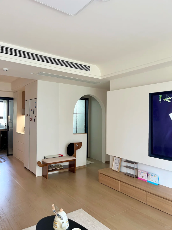 这是一处小户型的客餐厅过渡区,拱门造型柔和了空间棱角,浅木色地台电视柜与换鞋凳形成呼应。