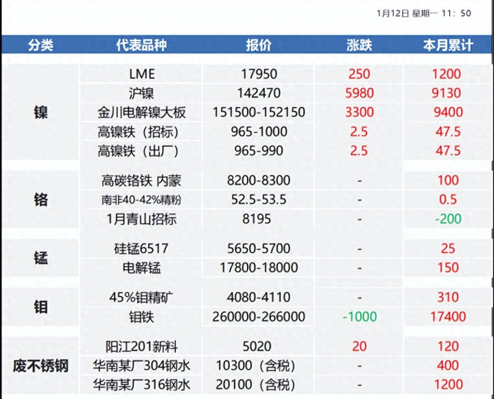 市场综述:1月12日华南废不锈钢行情继续稳中上行。广西钢厂304涨50,参考价201低碳料4900,304低碳料9750。