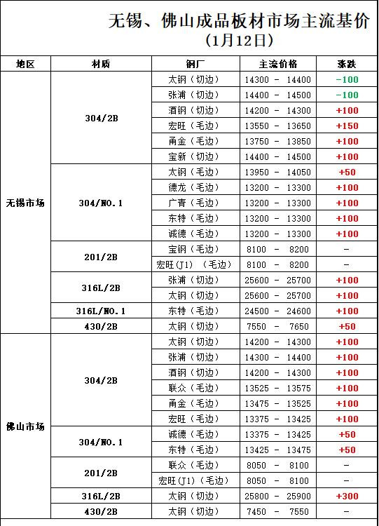 市场综述:1月12日废不锈钢市场价格稳中趋强,商家多跟涨期盘,实单成交稍有好转,部分散户利润符合预期后有积极出货打算。(价格条件:现款现汇、过磅、送货。)