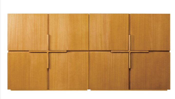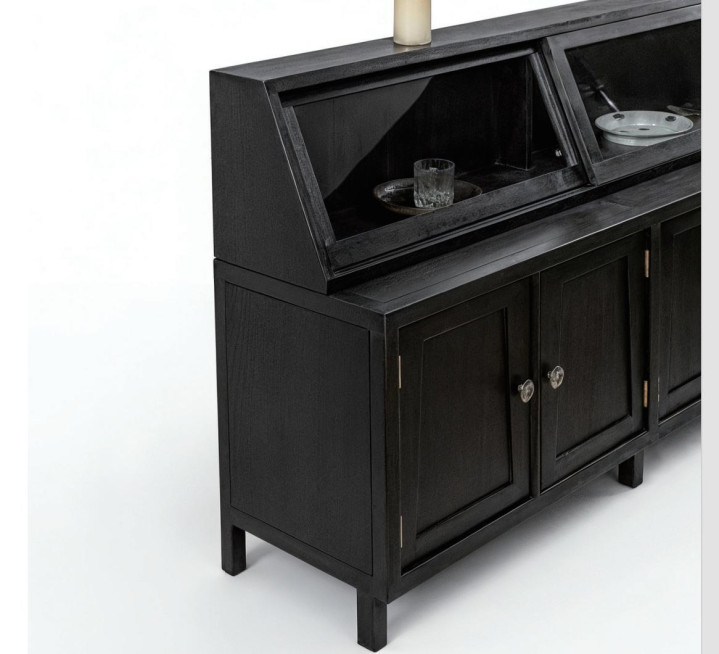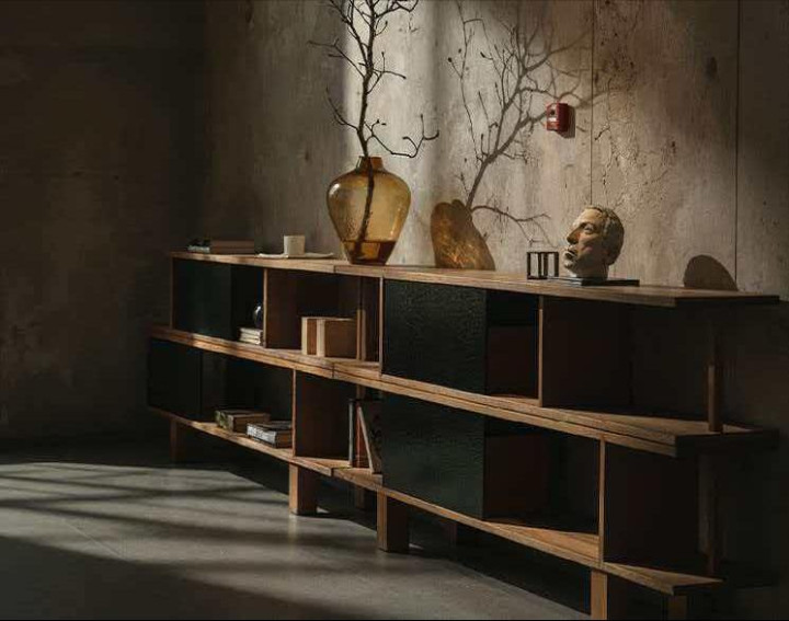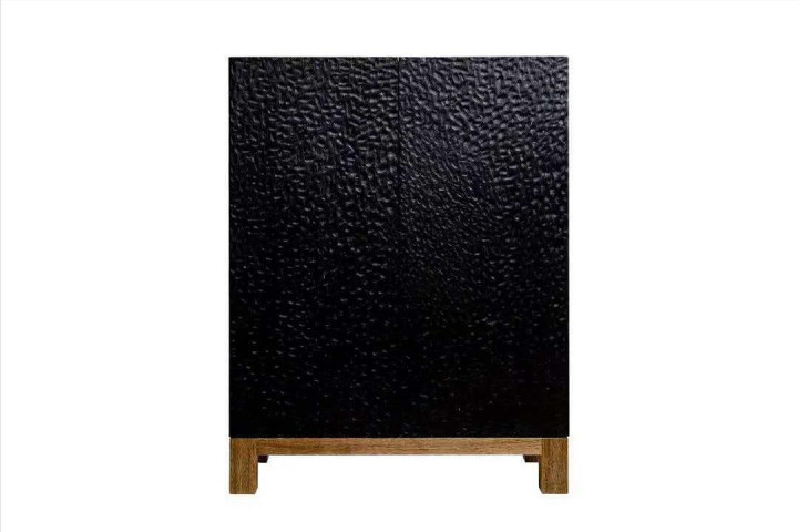 一改普通边柜平庸的柜门造型,工匠手工打磨处凹凸排序的造型,再做成高级黑的颜色,给方正的柜体表面带来非常强烈的视觉冲击,同时黑色与原木色形成明显的对比,更加深了柜子的个性。