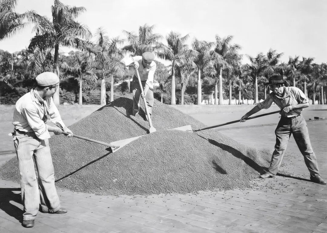 1940年,桑托斯港口附近晾晒咖啡豆的工人。截至 20世纪初,共有7万欧洲移民登陆巴西,其中六成是贫苦的意大利人。在他们的汗水挥洒下,咖啡经济保住增长势头