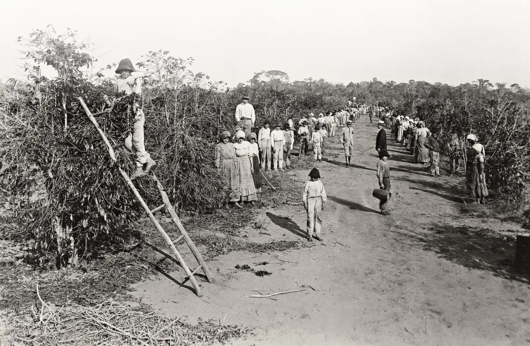 20世纪初,巴西种植园里采摘咖啡豆的劳工。帝国晚期,一些种植园引入简单机械,用于剥壳和晾晒等工序,可惜杯水车薪,于是引入了大量工业革命中失去土地的中欧和南欧农民